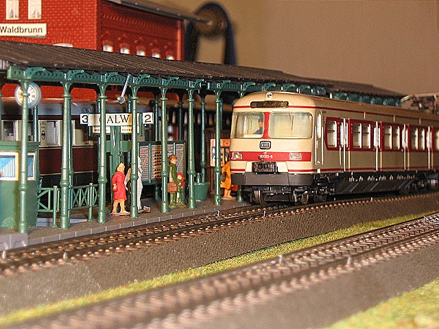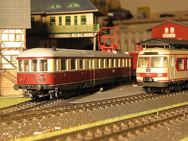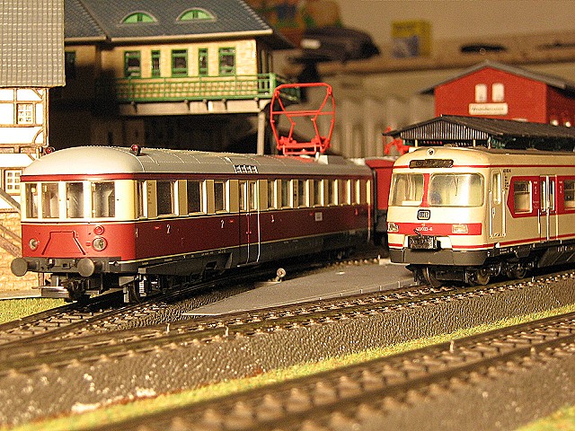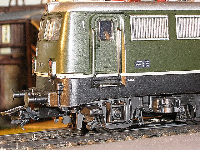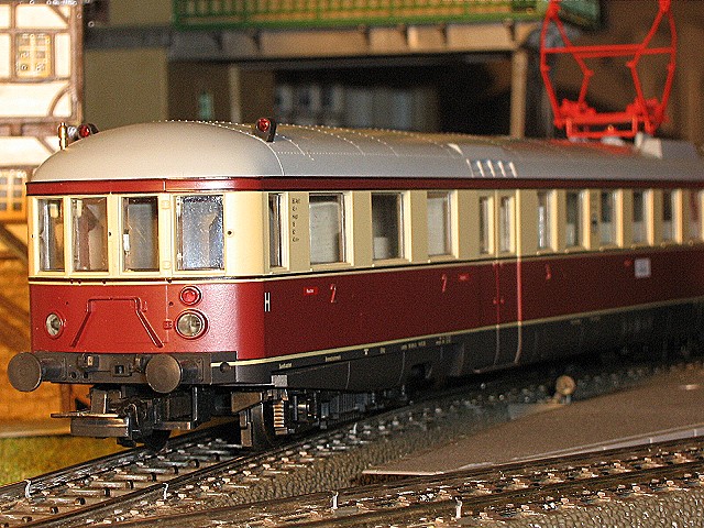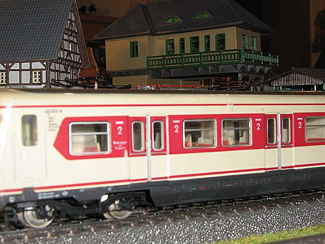 Der ET 25 fährt auch nicht schlecht, aber es ist kein Vergleich mit der E 40 oder auch dem ET 420 von Röwa. Der Zug hat keine Haftreifen und ist sehr leicht, was sich schon bei der kleinsten Unebenheit negativ bemerkbar macht. Die Räder drehen durch und der Zug bleibt fast stehen. Ich muß mal sehen ob es da vielleicht eine Möglichkeit gibt um Haftreifen aufzuziehen. Der Zug ist sehr schon detailiert und es sind noch einige Zurüstteile anzubringen, was ich aber noch nicht gemacht habe. Auch fehlt noch eine Innenbeleuchtung, die aber in kürze von einem Mitglied unseres MIST 47 eingebaut wird. Was sehr positiv ist, das ist die Stirnbeleuchtung. Sie wechselt von 3 x weiß auf 2 x rot. Diese roten Schlußlichter sind oben auf dem Dach, was auf den Bildern nicht so gut zu erkennen ist.