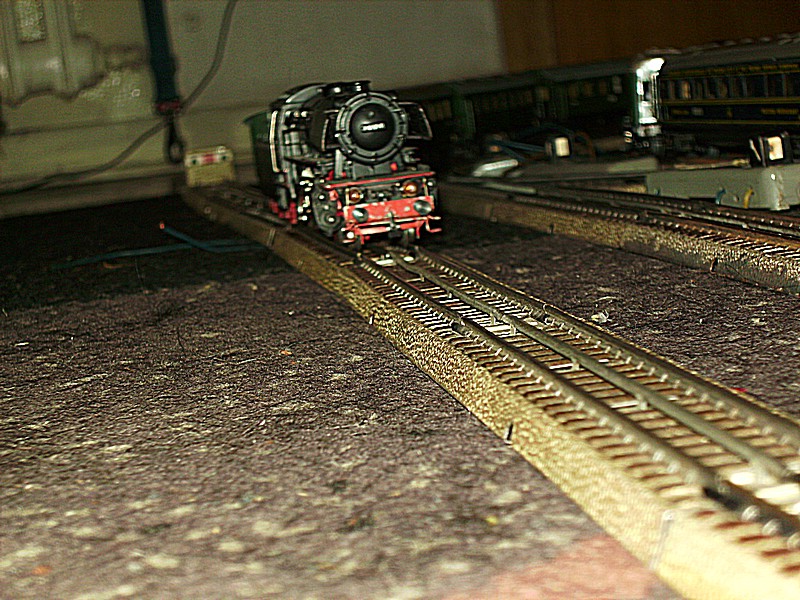 Bei diesem Probeaufbau hat sich gezeigt, das mir noch drei Weichen fehlen und einige Prellböcke. Aus diesem Grund wurde der rechte Bereich, also die Abstellgleise nicht mit aufgebaut. Der Plan hat sich als sehr gut herausgestellt und genau so wird die Anlage auch gebaut werden. Eine Änderung muß allerdings noch gemacht werden, das Abstellgleisrechts unten wird nicht gebaut, da ich auf der Platte noch Platz für die Stellpulte benötige. Auch der Lokschuppen wird wohl noch etwas auf sich warten lassen, aber den kann man ja auch noch nachträglich einbauen.