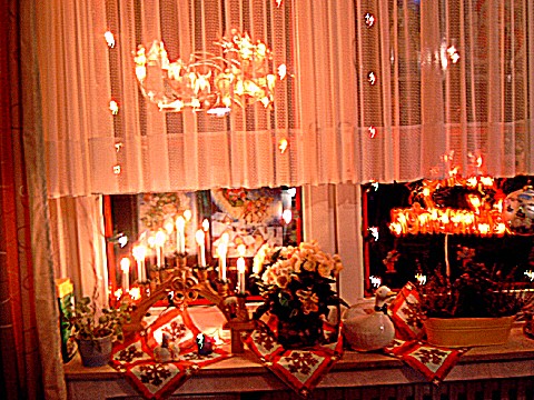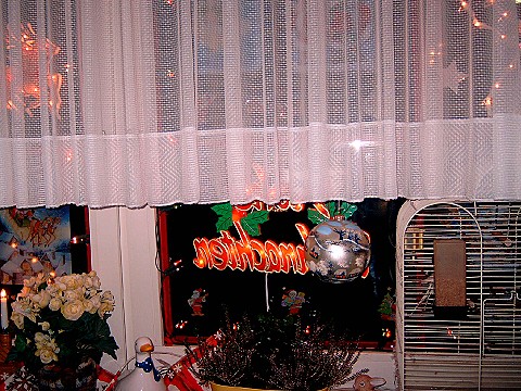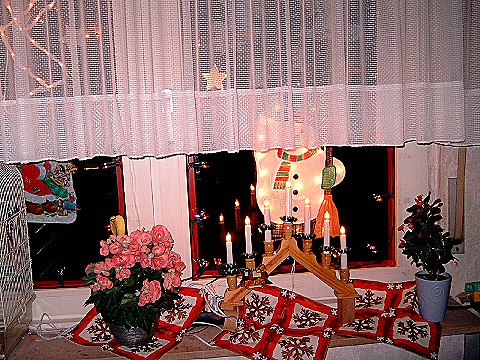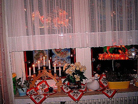Zuerst kam das Wohnzimmer dran, Fenster putzen, den Schrank abräumen, Staubwischen vor allen Dingen an den Ecken wo man selten drankommt usw. Das hat fast den ganzen Tag gedauert. Dann wurde das Fenster geschmückt, die Scheiben wurden mit rotem Klebeband eingeteilt, damit es wie kleine Fenster aussieht. Dann würde eine Lichterkette mit Tesa angebracht, Weihnachtslichtkörper mit Saugern angebracht und Fensterbilder angeklebt.