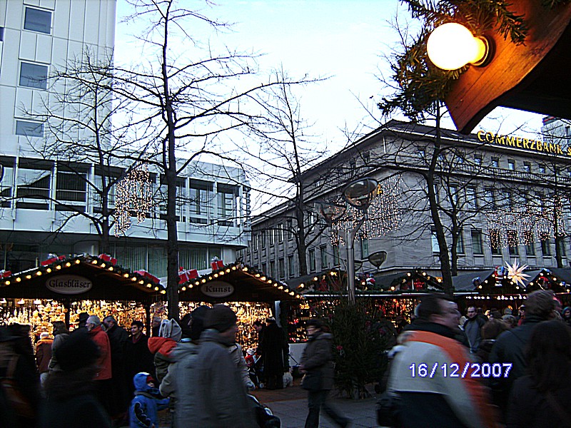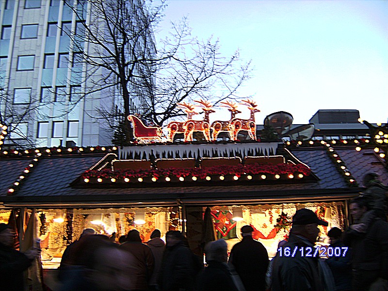 Der Duisburger Weihnachtsmarkt entpuppt sich leider immer mehr zur Freß - und Saufmeile. Vom Kuhtor bis fast zum Bahnhof erstrecken sich die Verkaufsbuden. Wenn man aber glaubt das es sehr viel weihnachtliches zu sehen gibt, den muß ich enttäuschen. In diesem Jahr wurden die Freß - und Saufbuden in Gruppen zusammen gefasst, was heißen soll das es immer mehrere dieser Buden auf beiden Seiten der Königstraße zu finden sind. Dazwischen gibt es dann Flohmarkt Artikel und auch hin und wieder etwas weihnachtliches, was aber eindeutig in der Minderzahl ist. Sehenswert ist wohl ein beleuchteter Baum vor dem neuen City Palais. Alleine für diesen Baum lohnt sich eine Fahrt nach Duisburg.