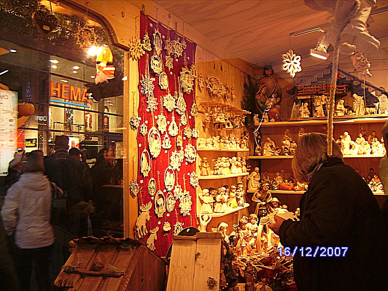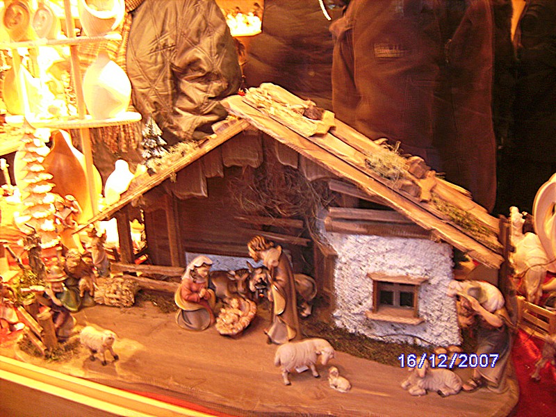 Am Sonntag Nachmittag herrschte schon ein reger Betrieb, der aber im Vergleich zum Nürnberger Christkindlesmarkt sehr gering, aber für Duisburg doch recht ordentlich war. Allerdings wurde fast nur gegessen und getrunken, denn diese Buden waren dicht umlagert. Der einzige Weihnachtsstand der sehr gut besucht war, war die begehbare Hütte von Käthe Wohlfahrt. Hier schlägt das Herz eines Weihnachst Nostalgikers Purzelbäume vor Begeisterung, wenn auch die angebotenen Artikel nicht gerade als preiswert anzusehen sind.. Eine weitere Hütte war ebenfalls sehr sehenswert da dort ein Krippenschnitzer seine Kunstwerke ausgestellt hatte und diese auch verkaufte. Es gab dort Krippenfiguren in allen Ausführungen, von traditionell bis super modern. Nur einen Stand der richtige Weihnachtskugeln verkaufte habe ich leider nicht gefunden. Es gab zwar auch Kugeln dort, aber das waren alles Sachen die nicht meinem Geschmack entsprachen.