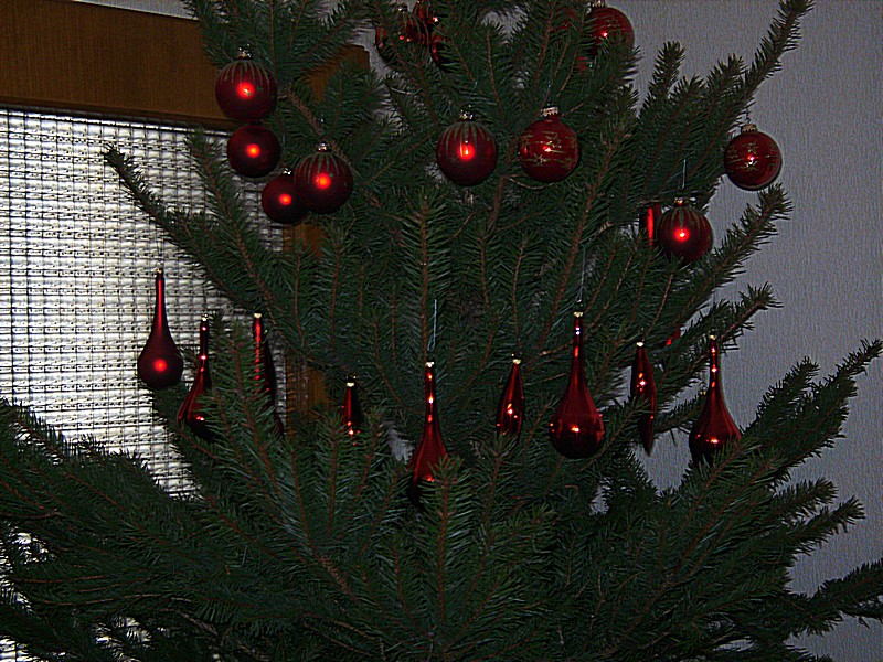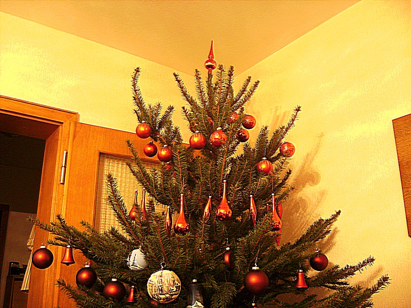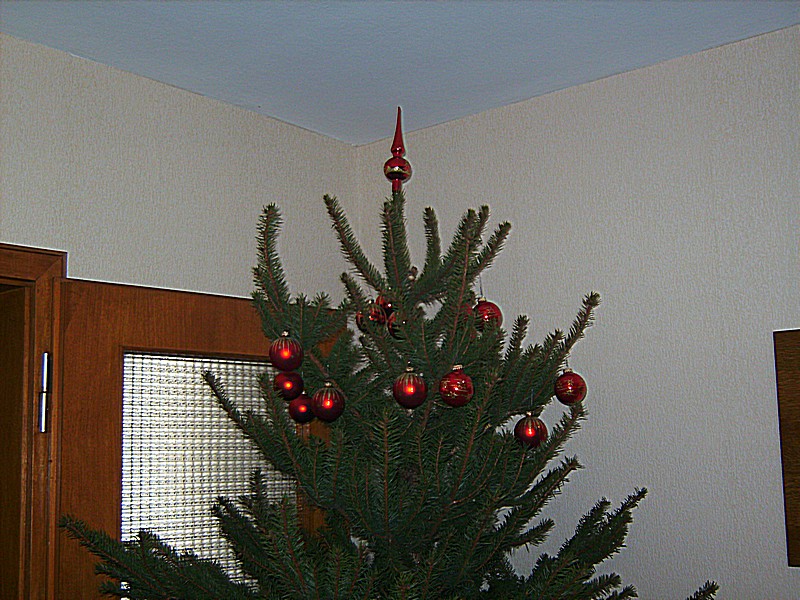 Nachdem der Baum an seinem Platz im Wohnzimmer stand, wurde zuerst die Spitze angebracht, die aber leider kaputt ist, denn ein Stück fehlt. Also werde ich am Mointag noch versuchen einen Ersatz zu bekommen. In diesem Jahr wurde der Baum ( fast ) komplett in rot gemacht, bis auf meine beiden Lieblingskugeln die sind hellblau und natürlich die neue Kugel aus Nürnberg. Diese drei Kugeln wurden bewußt zusammen gehängt und bilden so einen kleinen Block.